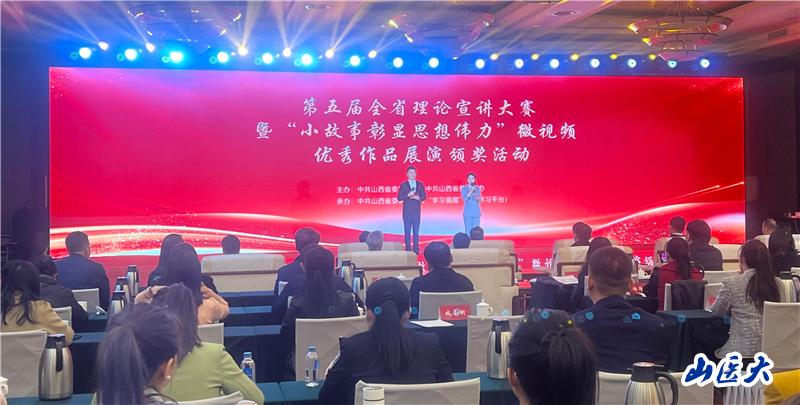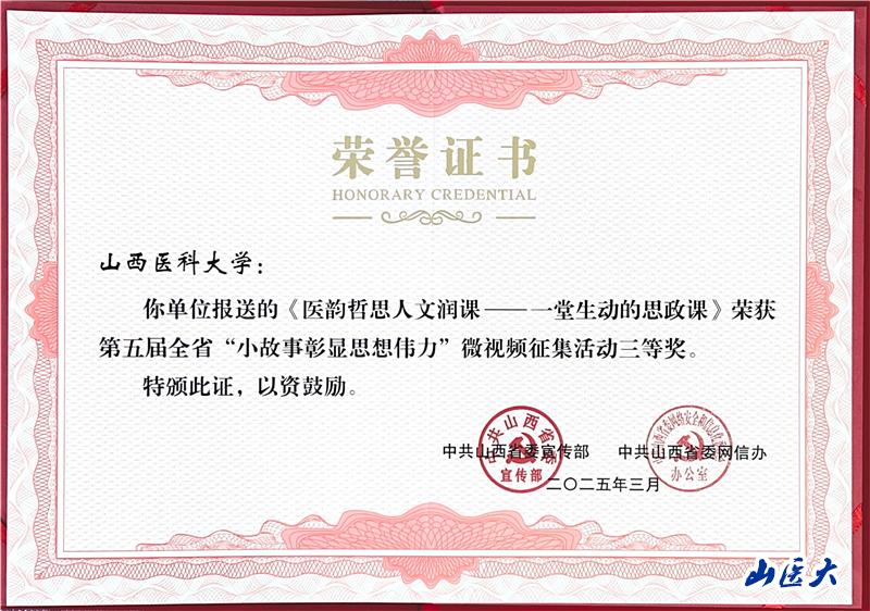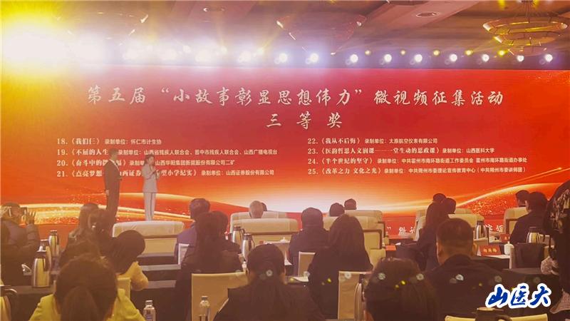 3月17日,3月17日,第五届全省理论宣讲大赛暨“小故事彰显思想伟力”微视频优秀作品展演颁奖活动在太原举行。省委常委、宣传部部长张碧涌出席并为获奖选手和单位颁奖。 我校视频作品《医韵哲思 人文润课——一堂生动的思政课》荣获三等奖。