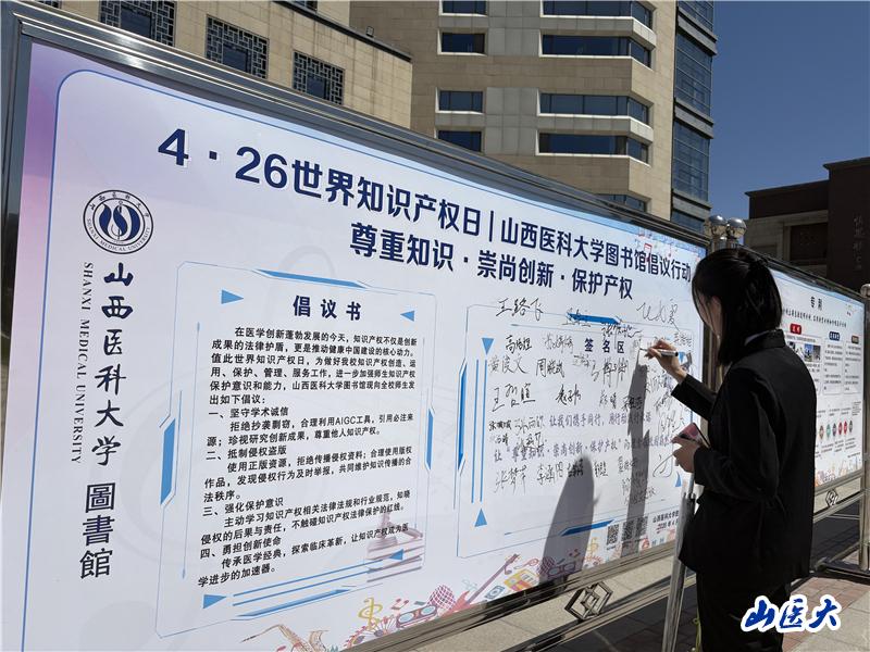 活动现场设置六大核心板块:倡议签名墙前,师生郑重签下《尊重知识·崇尚创新·保护产权》承诺书;知识产权科普展区通过图文并茂的形式以“基础—进阶—前沿”递进式结构,系统呈现知识产权全链条知识展板,吸引百余名师生驻足;“知识产权与人工智能”主题书展遴选80余册图书专著,供师生现场阅览;知识闯关与知产咨询区吸引百余名参与者,通过趣味竞赛普及产权法律知识,解答师生学术规范、专利申请等实务问题;线上服务推广和需求调研同步开展,收集有效问卷40余份,精准定位服务优化方向。活动同时联合太原市宣传委、中国知网开设版权登记绿色通道,专业人员提供“一对一”指导,助力我校19件富有医学特色的师生原创作品完成确权登记,涵盖摄影、文字、书法、美术、小视频等多个类别,为校园创新成果穿上“法治铠甲”。