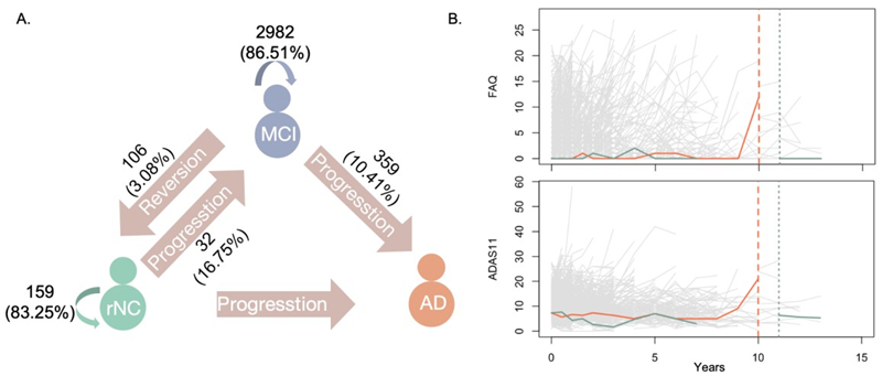 图1 MCI的多维演变模式及认知状态间转归路径数量(A)和两名受试者纵向观测与认知结局(B)