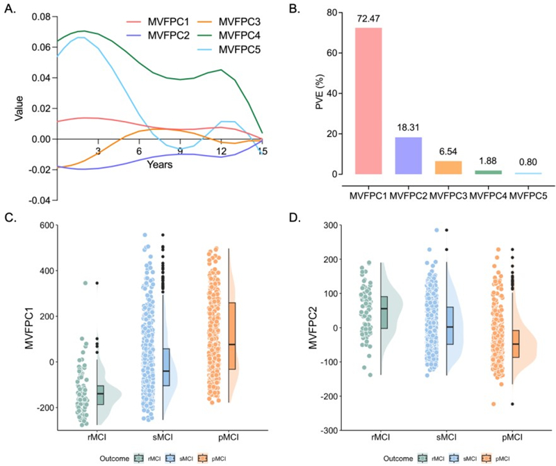 该研究引入双重研究目标(降维与动态建模),采用多变量函数型主成分分析(MVFPCA)捕捉多维度纵向认知的异质性模式(图2),采用多层函数型主成分分析(MLFPCA)提取灰质体积比的时空信息(图3和图4);开发函数型多状态模型,整合上述函数型纵向标志物,以刻画MCI初诊后不同认知状态间的动态转归路径(图5)。